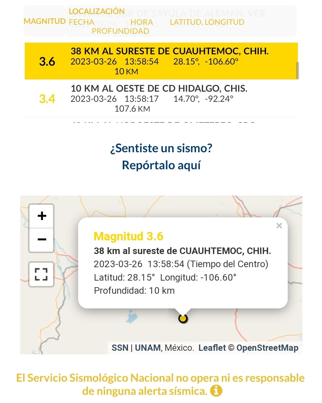 La Coordinación Estatal de Protección Civil dio a conocer que durante la tarde del domingo 26 de marzo, se registró un movimiento telúrico sobre la región occidente de la zona serrana, sobre el municipio de Cusihuiriachi a 38 kilómetros (km) al suroeste de la ciudad de Cuauhtémoc, con una profundidad de 10 km.
