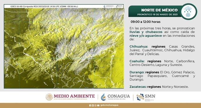 De acuerdo con el pronóstico que emite el Servicio Meteorológico Nacional, se prevé que, para las próximas horas, continúen las precipitaciones en forma de lluvia en gran parte del territorio estatal, debido al paso de la Décima Tormenta Invernal de la temporada.
