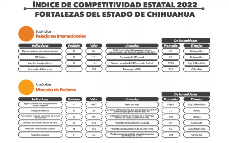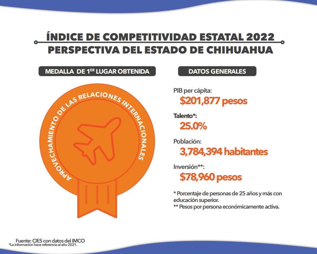 Este año, el subíndice de Relaciones Internacionales lo encabeza Chihuahua, seguido de Coahuila, Aguascalientes, Baja California y Tamaulipas, posición que ubica a esta entidad con un 58.03% en el índice de aprovechamiento, lo que supera con creces, el promedio nacional, que es de 23.88, colocando a Chihuahua económicamente por encima de importantes estados como Nuevo León y Ciudad de México.