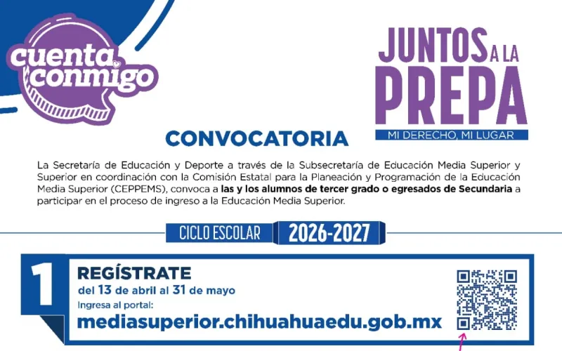 La Secretaría de Educación y Deporte (SEyD) informó que del 13 de abril al 31 de mayo se realizará el Registro Único en Línea para aspirantes a planteles públicos de Educación Media Superior, ciclo escolar 2026-2027, como parte de la estrategia “Juntos a la Prepa. Mi Derecho, Mi Lugar”.