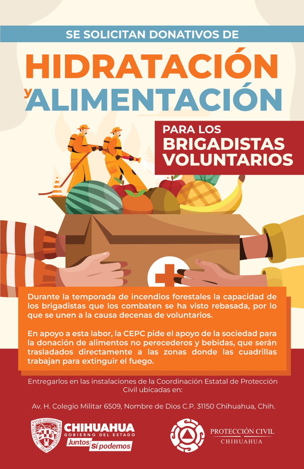 La dependencia solicitó la colaboración de los chihuahuenses con la donación de víveres como: café, azúcar, leche en envase de cartón, galletas, barras, bebidas energéticas y cualquier tipo de alimento enlatado, para hacerlos llegar oportunamente a los campamentos.