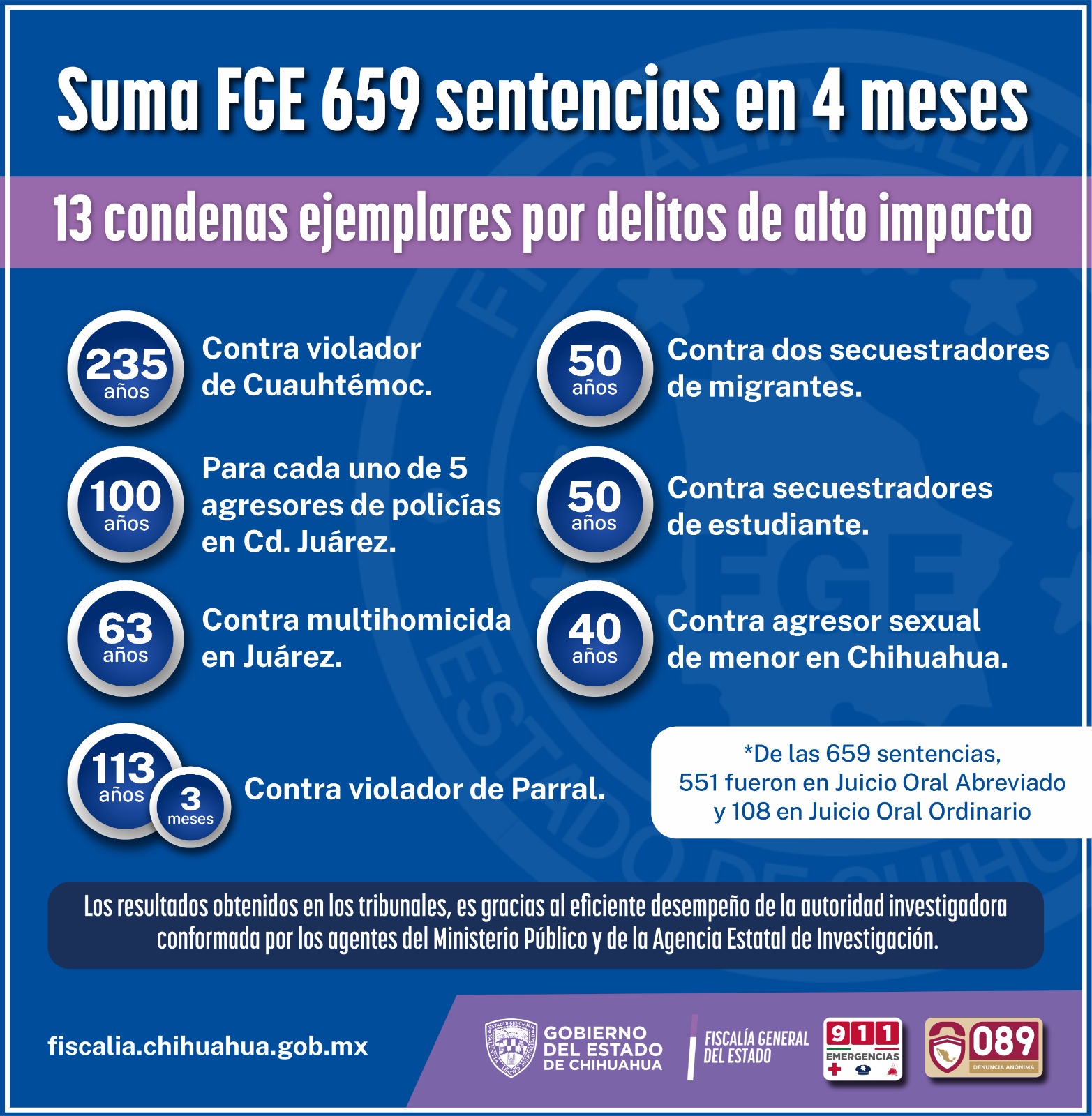 Con la más reciente sentencia de 113 años de prisión obtenida en Juicio Oral en contra de un acusado por el delito de violación agravada en perjuicio de una adolescente en la ciudad de Parral, así como la de 100 años en contra de cada uno de los 5 declarados responsables de intento de homicidio de policías municipales en Ciudad Juárez, la Fiscalía General del Estado sumó 13 condenas ejemplares por delitos de alto impacto de diciembre de 2024 a marzo del 2025.