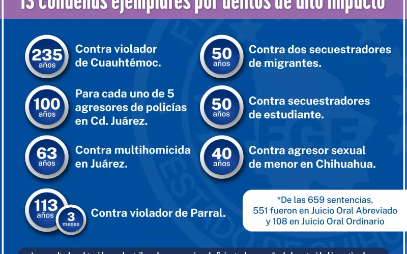 La condena más significativa de los últimos meses, se emitió el pasado 12 de marzo en el Distrito Judicial Benito Juárez con sede en ciudad Cuauhtémoc, en donde se decretaron 235 años de prisión en contra de un acusado de violación y abuso sexual en perjuicio de un menor de edad, de entonces 10 años de edad, ya que el delito se cometió en el año 2021.