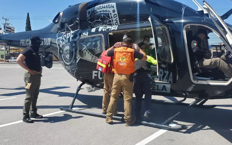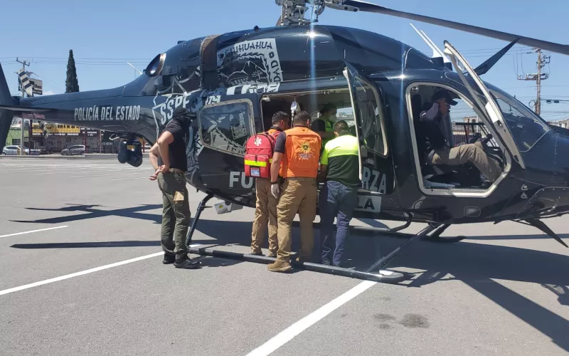 La aeronave aterrizó en la explanada del Centro de Convenciones de Chihuahua, desde donde paramédicos de la Unidad de Rescate del Gobierno del Estado (URGE), lo trasladaron vía terrestre a la Unidad de Quemados del nosocomio en mención.