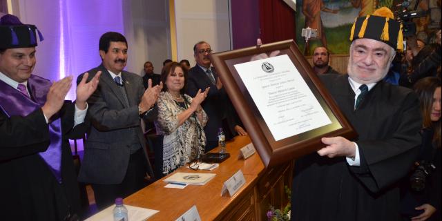 El gobernador Javier Corral y el rector de la Universidad Autónoma de Chihuahua (UACH), Luis Fierro, entregaron la investidura “Doctor Honoris Causa” al escritor Ignacio Solares, así como la Presea al Mérito Académico “8 de Diciembre” a la derecho humanista, Luz Estela Castro, como parte de la celebración del LXII Aniversario de la creación de la Universidad, que se conmemora el 8 de diciembre de cada año.