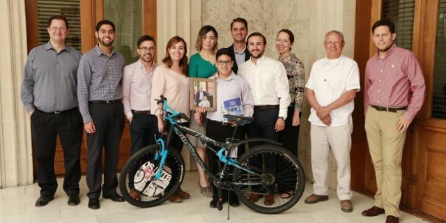 Después de una plática amplia con el Coordinador Madero Muñoz, Kevin recorrió los pasillos de Palacio de Gobierno y al final de la jornada recibió algunos presentes, como un Dron, una bicicleta y la foto oficial debidamente firmada.