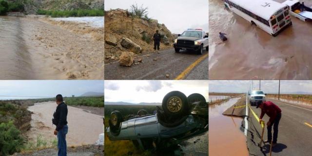 Los fuertes torrenciales causaron además, el bloqueo de cinco tramos carreteros, tanto por corrientes de agua, como por derrumbes de rocas de gran tamaño. Uno de ellos fue en la carretera federal de Coyame hacia Aldama, que dejó incomunicada a la localidad de La Paz de México, habitada por 50 familias, problema que dijo, ya ha sido resuelto.