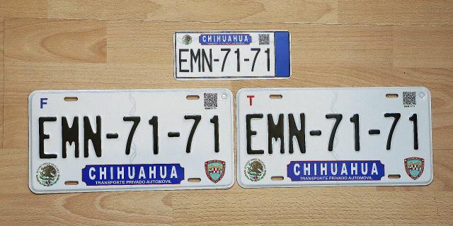 Los juegos metálicos de identificación vehicular que estarán a disposición de las y los propietarios de automóviles y camiones tienen por ilustraciones los escudos del Estado de Chihuahua y de la República Mexicana, así como el código QR y las letras “F” correspondiente a la que se debe colocar en el frente del vehículo, y “T”, en la parte trasera.