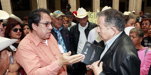 El secretario de Desarrollo Social, Víctor Quintana, atendió las peticiones de un grupo de exbraceros que se manifestaron en el patio de Palacio de Gobierno en demanda de apoyos, como son la inclusión en la tarjeta Vive a Plenitud con becas alimentarias, servicio médico y vivienda, entre otras.